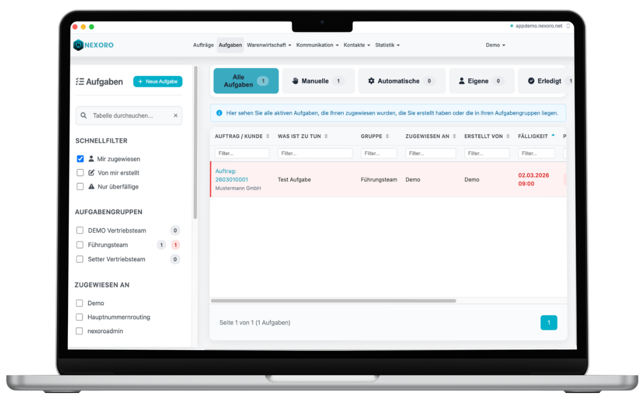 Mit der Nexoro Mobile App hast du volle Kontrolle über deine Aufträge, Kunden und Kommunikation – jederzeit und überall.